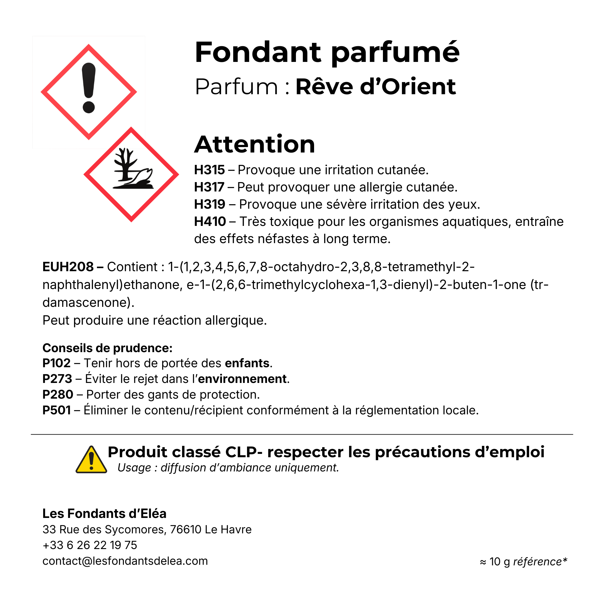 Le fondant parfumé Rêve d'Orient installe une ambiance chaleureuse et raffinée, entre muscs doux et bois lumineux. Une senteur cocooning, idéale pour donner du caractère à votre intérieur, sans être entêtante.